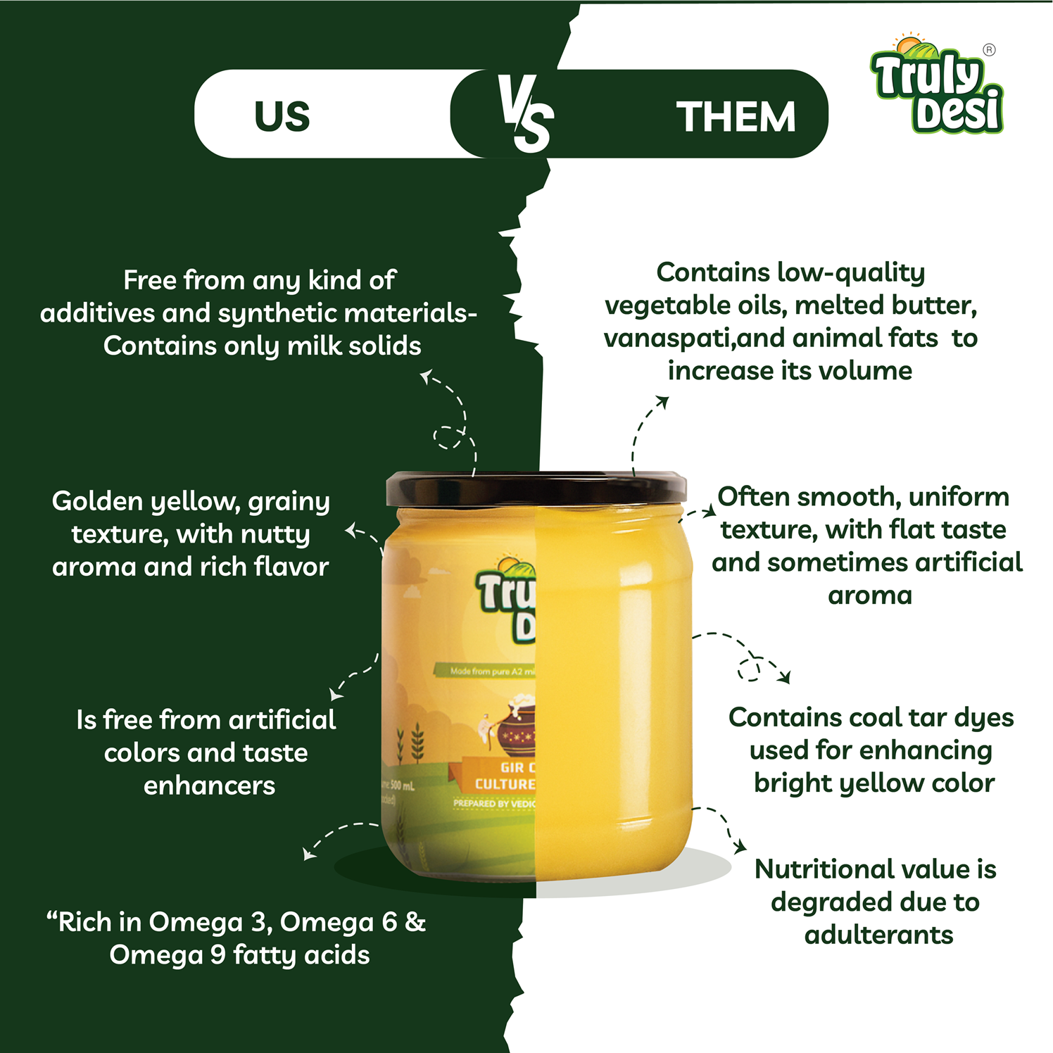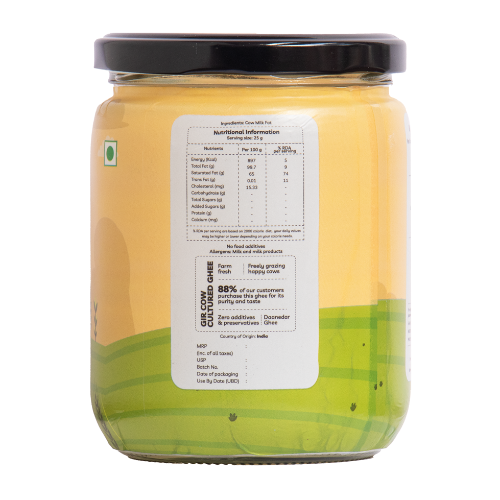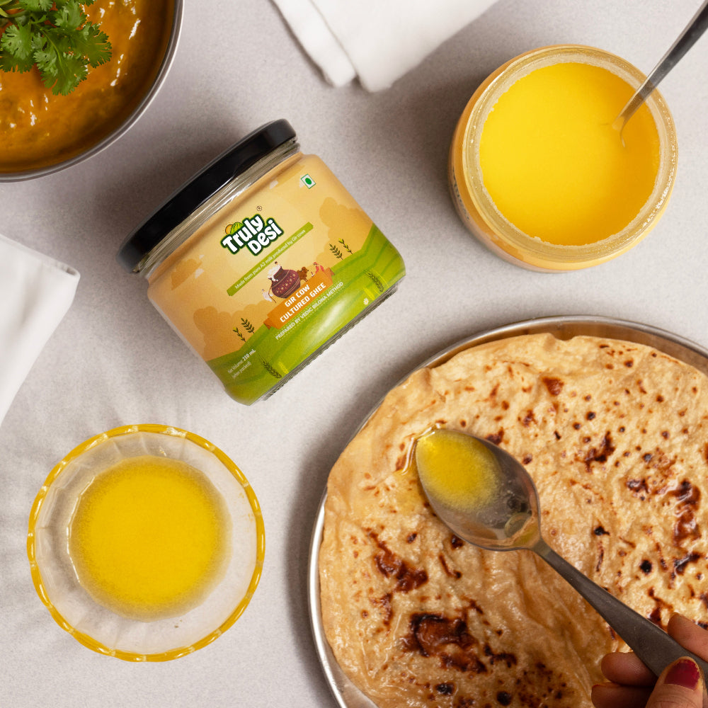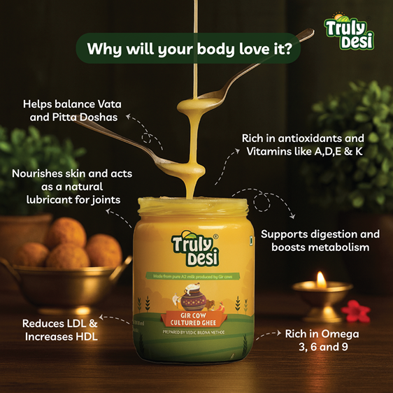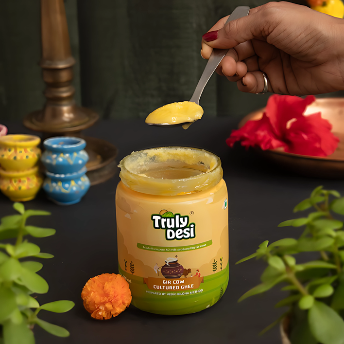 Pure cow ghee is a rich source of healthy fats. It contains vitamins A, D, E, and K. It supports digestion, brain function, and immunity. A2 Gir Cow Ghee from Truly Desi provides Omega-3 fatty acids and CLA (conjugated linoleic acid), which are beneficial for heart health and metabolism.