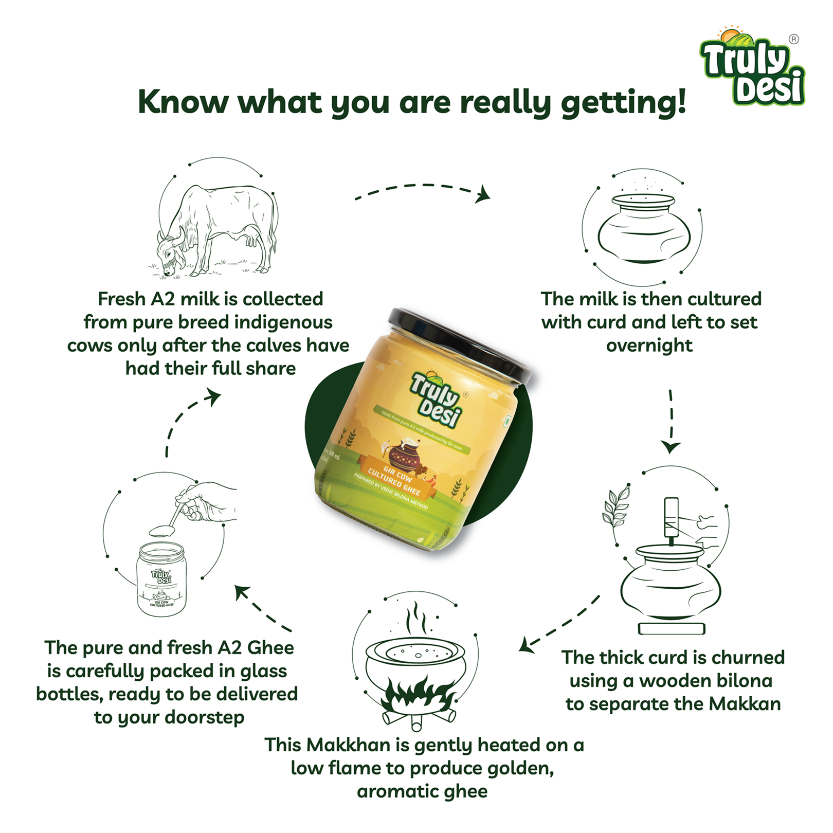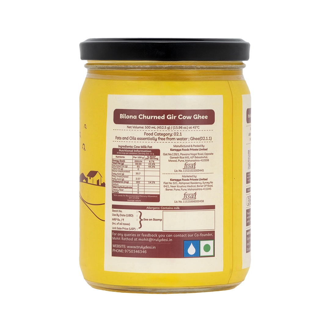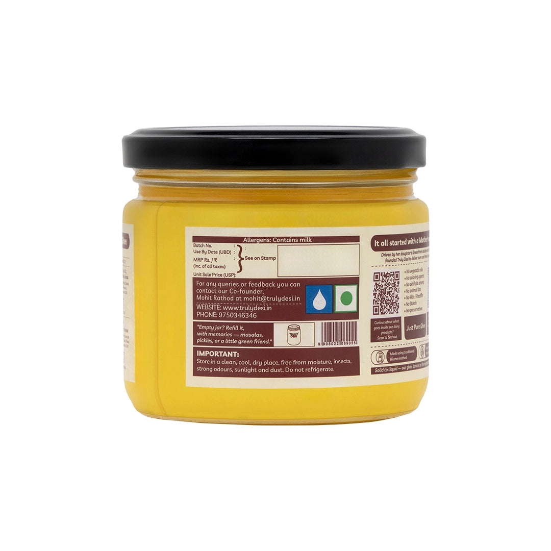 Most commercial ghee available in the market is made by processing cream and is often laced with cheap adulterants and preservatives, making it cheaper but far inferior in quality and nutrition. At Truly Desi, we craft our ghee using the traditional Bilona method — a slow, time-honored process where cultured curd made from Gir cow A2 milk is churned to extract butter, which is then slowly simmered to make ghee. This method yields just 1 kg of ghee from approximately 30 liters of milk making it much more expensive.