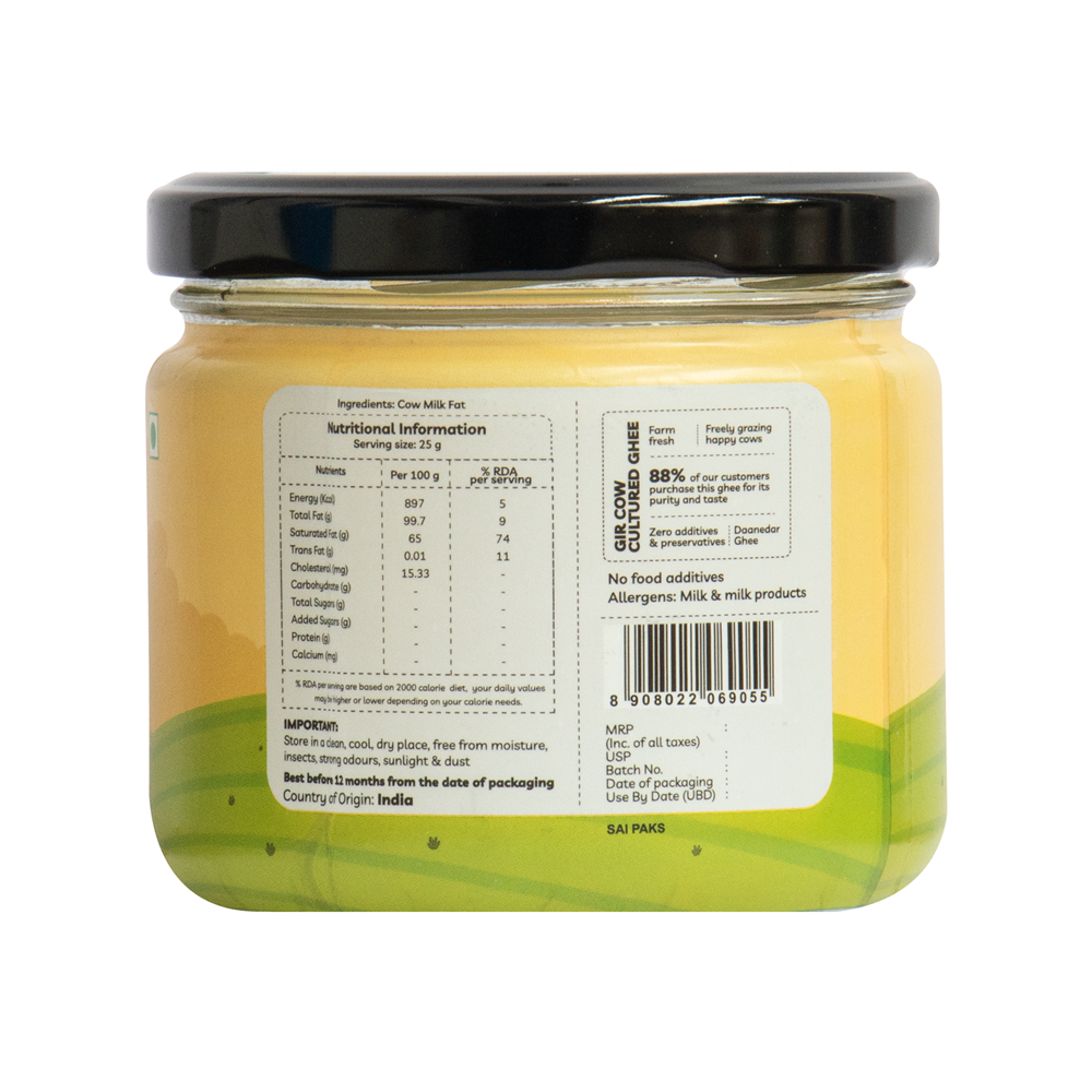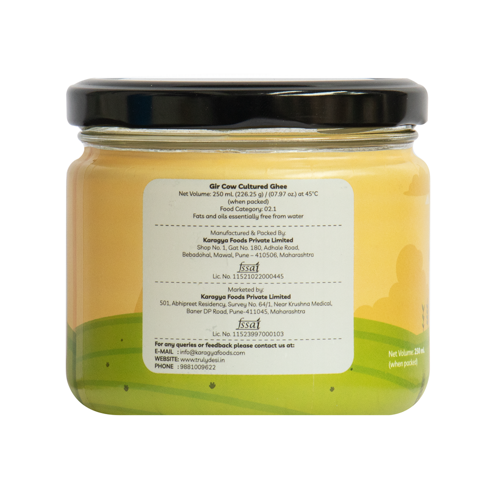 Cultured cow ghee is made by fermenting curd (dahi) using traditional methods. This is not made from cream or malai. At Truly Desi, we follow the Bilona method where curd is churned to extract butter, which is then slowly heated to make ghee. This process enhances its digestibility, taste, and nutrition.