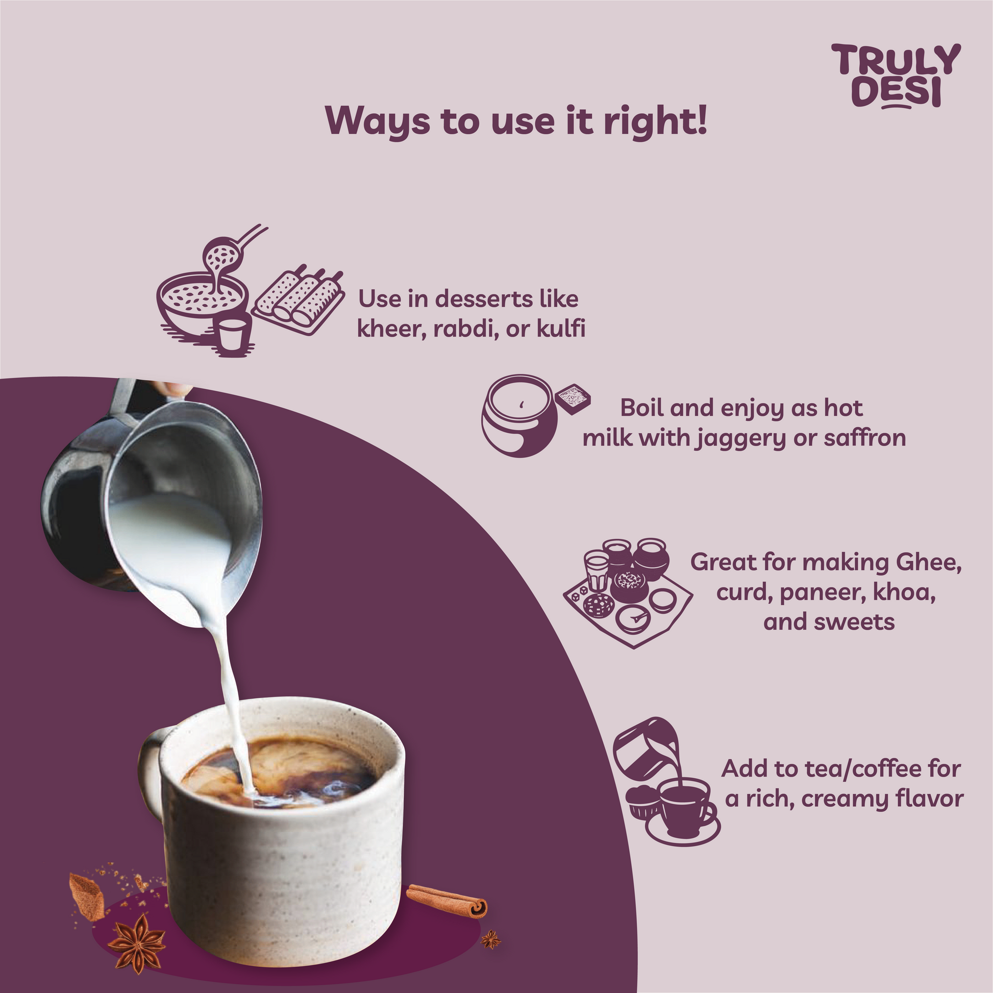 Buffalo milk is rich in essential nutrients. It contains high-quality protein that supports muscle growth. It is rich in calcium, which is good for strong bones and teeth. It also has healthy fats that give long-lasting energy. Buffalo milk provides important vitamins like Vitamin A and D, and minerals like magnesium and phosphorus which support metabolism and immunity.