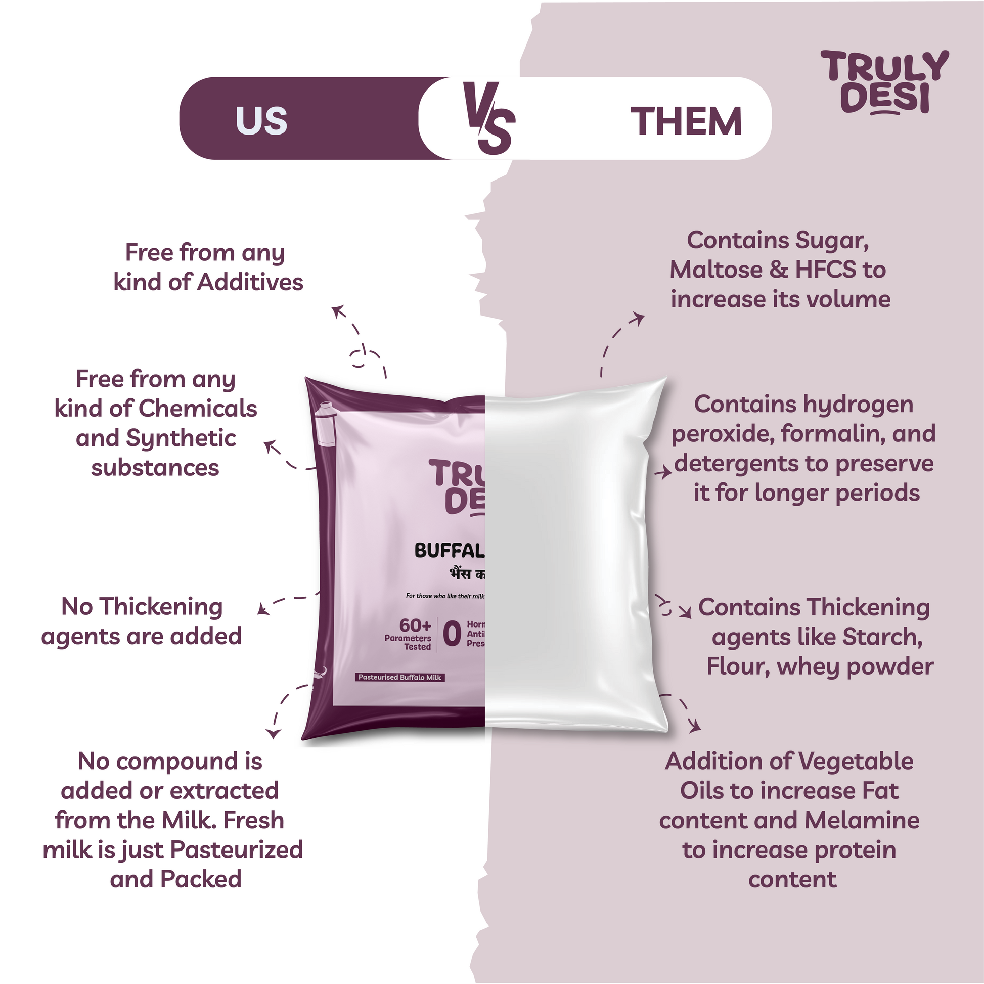 Both types of milk have their own benefits. Buffalo milk is thicker, creamier, and has more fat and protein. This makes it ideal for people who want more nutrition or prefer tea, coffee or smoothies while Cow milk is lighter, contains less fat, and is easier to digest for some.